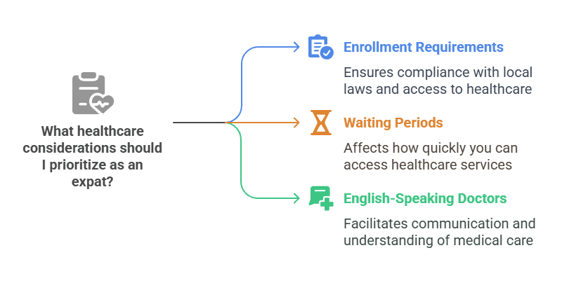 ينبغي على المغتربين البحث بدقة في وضع الرعاية الصحية المحلي واللوائح التنظيمية في بلد المقصد. يشمل ذلك فهم إجراءات التسجيل في نظام الرعاية الصحية الحكومي، وفترات الانتظار قبل بدء التغطية، وتوافر خيارات التأمين الصحي الخاص. من المهم أيضًا مراعاة جودة الرعاية، وتوافر مقدمي الرعاية الصحية الناطقين باللغة الإنجليزية، وأي سياسات خاصة قد تؤثر على المغتربين، مثل تلك المتعلقة بالحالات الصحية السابقة.
