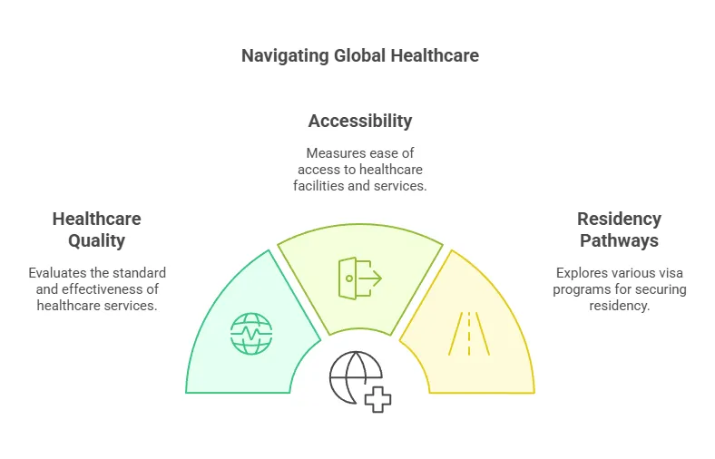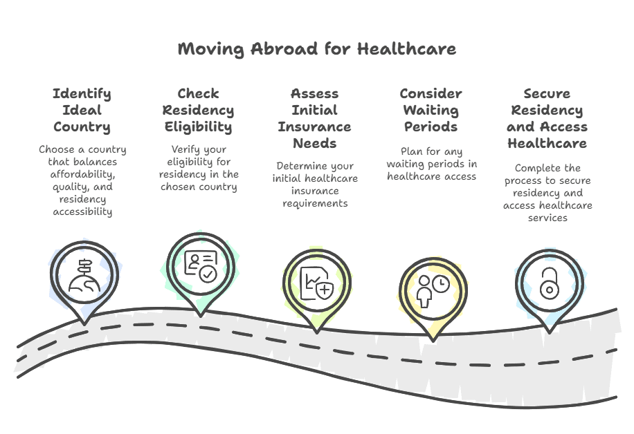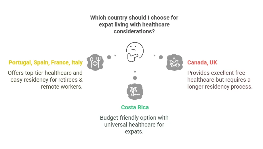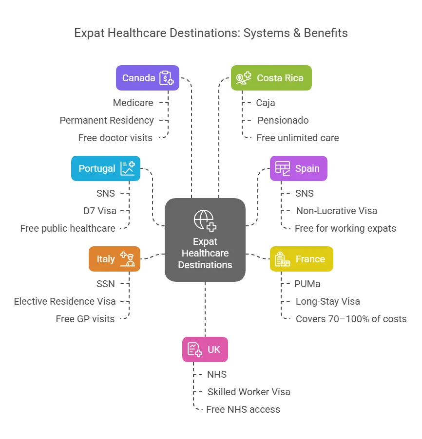 عند مراعاة خيارات رعاية صحية بأسعار معقولة للمغتربينمن الواضح أن العديد من البلدان تتميز بالجمع بين خدمات طبية عالية الجودة مع مسارات إقامة يمكن الوصول إليها. الدول الأوروبية مثل البرتغال، إسبانيا، فرنسا، وإيطاليا تقدم الدول المتقدمة رعاية صحية من الدرجة الأولى وخيارات تأشيرة سهلة نسبيًا لأولئك الذين لديهم دخل ثابت أو عمل - مما يجعلها وجهات رئيسية للمتقاعدين والعاملين عن بعد الذين يسعون للحصول على رعاية صحية "مجانية" في الخارج. كندا والمملكة المتحدة توفير رعاية صحية وفق المعايير الغربية ولغة/ثقافة مألوفة، مع أن الحصول على الإقامة قد يكون أكثر تنافسية. في غضون ذلك، كوستا ريكا وتظهر الدراسة أنه حتى في العالم النامي، يمكن للمرء أن يجد رعاية صحية شاملة وترحيباً حاراً بالمتقاعدين الأجانب.