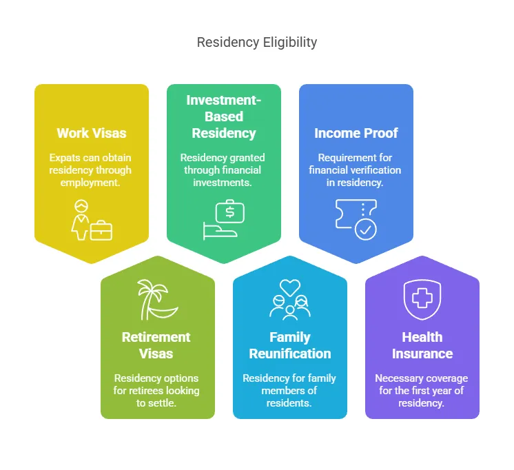 أهلية الإقامة هذا هو الجانب الآخر من العملة. يحتاج المغتربون إلى مسار للإقامة القانونية للحصول على الرعاية الصحية العامة. سنوضح الجوانب الشائعة مسارات الإقامة - من تأشيرات العمل وإعادة توحيد الأسرة إلى تأشيرات المتقاعدين وبرامج الاستثمار - ولاحظ أي متطلبات خاصة (مثل الحد الأدنى للدخل لتأشيرات المتقاعدين أو التأمين الصحي للموافقة على التأشيرة).