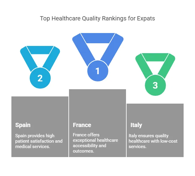 جودة الرعاية الصحية أمر بالغ الأهمية - يرغب المغتربون في التأكد من أن الرعاية التي يتلقونها في الخارج تعادل (أو أفضل) الرعاية التي يتلقونها في وطنهم. على سبيل المثال، غالبًا ما يُستشهد بفرنسا كمقدمة "أفضل رعاية صحية شاملة" تُصنّف منظمة الصحة العالمية دولًا مثل إسبانيا وإيطاليا وسنغافورة ضمن أفضل الدول في مختلف مؤشرات الصحة. عادةً ما تعكس التصنيفات العالية نتائج طبية ممتازة، وسهولة الوصول إلى الخدمات الصحية، ورضا المرضى.