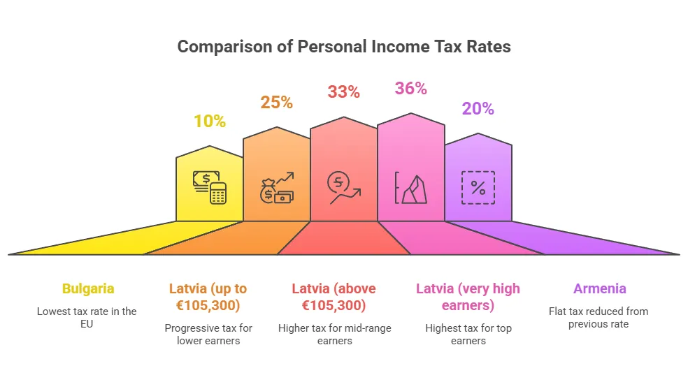 Üksikisiku tulumaks (PIT) mõjutab üksikinvestoreid, kaugtöötajaid ja kõiki, kes saavad neis riikides palka või äritulu. Need kolm jurisdiktsiooni kasutavad selgelt erinevat lähenemist: Bulgaaria ja Armeenia kehtestavad ühtse tulumaksumäära (olenemata sissetulekutasemest), kusjuures Lätis on kasutusel progressiivne kahetasandiline süsteem väga kõrgete sissetulekute puhul lisatasuga. Igas riigis maksustatakse erinevat aastasissetulekut erinevalt.