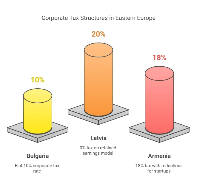 Võrdlev märkus: Le kontsern või ettevõtja, kes otsustab nende riikide vahel, võib valik sõltuda ärimudelist. Kui keegi plaanib kasumit oluliselt reinvesteerida, Läti jaotamata kasumi 0% on äärmiselt ahvatlev. Kui keegi soovib absoluutselt madalaim kohustuslik määr ja lihtsus, Bulgaaria 10% CIT on raske ületada. Kui keegi ehitab a väike idufirma (eriti tehnika vallas) või taotledes mõõdukate maksude ja erivabastuste kombinatsiooni, võib Armeenia režiim anda madalaima maksuarve (teatavate programmide puhul potentsiaalselt 0%).