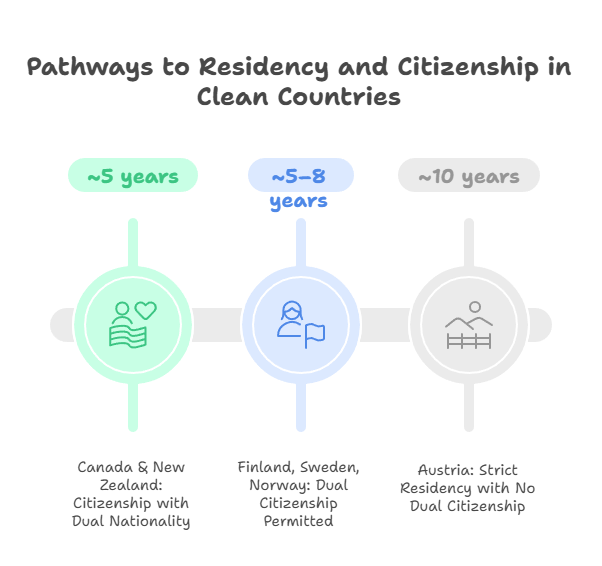 Work Visas and Skilled Migration: Most expats move via employment visas or skilled worker programs. Countries like Canada and New Zealand have structured points-based systems that actively invite skilled immigrants. Canada’s Express Entry system, for example, lets qualified workers obtain permanent residency in as fast as six months after receiving an invitation, due to its efficient processing. This means a software engineer or healthcare professional could move to Canada and be a PR (green card equivalent) within a year of applying. New Zealand similarly offers a Skilled Migrant Category that scores applicants on factors like age, experience, and job offer; those meeting the points threshold can get a resident visa (typically leading to PR) relatively quickly. In Europe, the process often requires a job offer from a local employer first. Germany issues EU Blue Cards and work visas to those with in-demand skills – after 33 months (or 21 months with advanced language skills) on a Blue Card, you can get permanent residency in Germany. Sweden, Norway, Finland, and Denmark all have work permit schemes for skilled non-EU nationals, usually requiring a job contract and meeting a salary threshold. The timeline to permanent residence in these Nordic countries is around 4–5 years of continuous work residency (Norway is faster at 3 years for PR, Sweden typically 4 years, Finland 4 years) after which one can reside indefinitely. In Austria, the Red-White-Red Card program assigns points for education, work experience, and even German language; a qualified professional can get a 2-year residency that leads to a PR permit after 5 years. Each country has nuances – e.g. Denmark has a Positive List for occupations where foreigners are needed and a Pay Limit Scheme for high-income expats. Overall, for a skilled expat willing to work in sectors like IT, engineering, healthcare, or academia, all these countries offer a clear pathway to residency. English-speaking countries like Canada and New Zealand may be easier initially due to language, while European countries might require learning the local language for long-term settlement (and later citizenship tests).