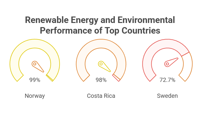 Sustainability & Green Energy: A strong commitment to sustainability is a hallmark of these countries. Many are at the forefront of renewable energy adoption and climate policies. For example, Norway gets about 98–99% of its electricity from renewable sources (mostly hydropower), and aims to drastically cut greenhouse emissions by 2050. Costa Rica is famous for running on 98% renewable electricity (primarily hydro and geothermal), proving that a modern grid can be clean. Sweden is a green innovation leader – it has an Environmental Performance Index (EPI) score of 72.7 and ~67% renewable power generation. Governments in these nations actively support environmental protection policies. In fact, 80–89% of expats in Finland, Sweden and Norway agree their host government prioritizes pro-environment policies. Choosing a country with green energy and climate-forward policies means your new home is actively working toward sustainability and low pollution, aligning with eco-conscious lifestyles.