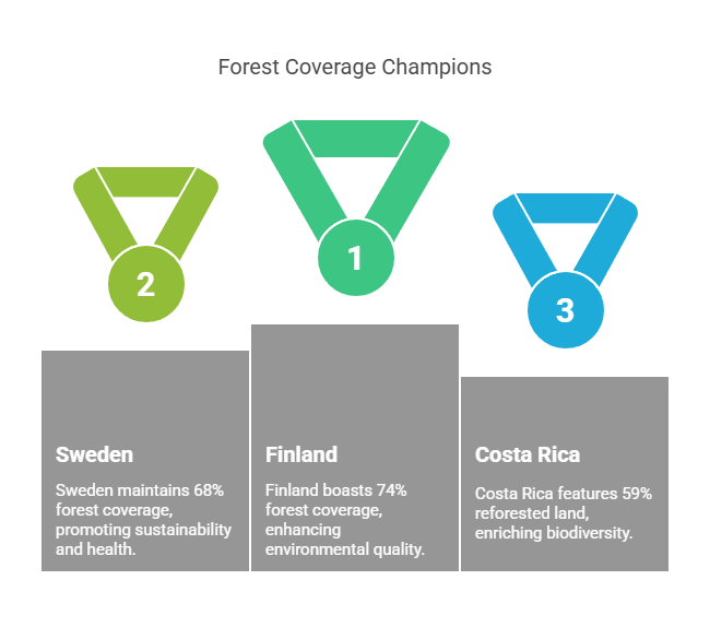 Green Spaces & Nature: Ample parks, forests, and green spaces contribute to cleaner air and a healthier lifestyle. These countries are blessed with natural beauty and they preserve it well. Finland and Sweden are blanketed by forests – roughly 74% of Finland’s land area is forested – offering countless opportunities for outdoor recreation like hiking and cycling. Costa Rica has reforested impressively; over 59% of its land is covered in forests, including protected rainforests teeming with biodiversity. Expats often highlight how easy it is to access unspoiled nature. In Switzerland, for example, a resident noted the “beautiful nature that is easy to access” with plentiful lakes and parks. Similarly, New Zealand is famed for its national parks, and Canada’s vast wilderness provides clean environments even near cities. Urban planning in places like Denmark and Germany also integrates green space – Copenhagen and Munich consistently rank as green, livable cities. Living amidst greenery not only improves air quality but also encourages an active lifestyle and reduces stress, boosting overall well-being.