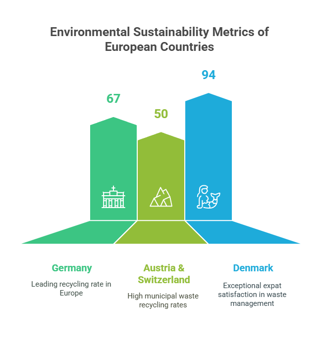 Waste Management & Recycling: Efficient waste management keeps the environment cleaner. Many of these countries have some of the highest recycling rates in the world. Germany, for instance, recycles roughly 67% of its municipal waste – the highest in Europe. Rigorous sorting of recyclables and innovative reuse programs are common there. Austria and Switzerland also recycle roughly half or more of their waste. Expats take note of this emphasis on recycling – 90% of expats in Austria and 83% in Switzerland are happy with local waste management efforts. Denmark too is praised for its recycling culture; 89% of expats in Denmark are satisfied with waste management. In these countries you’ll find convenient recycling bins, bottle deposit systems, and waste-to-energy plants that minimize landfill use. This means a cleaner community and the satisfaction of knowing your new home is serious about reducing waste and pollution.