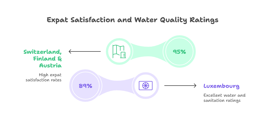 Water Quality & Sanitation: Access to clean drinking water and modern sanitation is virtually universal in the top green countries. Expats rate water quality in places like Finland, Switzerland, and Austria extremely high – e.g. 96% of expats in Finland praise the water and sanitation infrastructure. Switzerland similarly enjoys 95% positive ratings for water purity. In Luxembourg, expats noted the “quality of water and sanitation” is excellent (about 89% satisfied). In short, these nations have advanced water treatment and plumbing systems, so you can drink tap water with confidence. Clean water and effective waste water management protect public health and the environment.