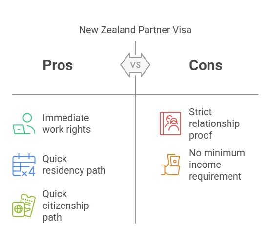 | New Zealand | Spouse/partner (including unmarried); children < 21; (parents via limited quota) | Sponsor must be Citizen/PR (or on work visa for temporary sponsorship); No minimum income for partner, but must show ability to support and cohabitation ≥12 months for residence | ~6–9 months for partner residence 1–2 months for partner work visa; Parent residence limited and slow. | Benefit: Spouse gets residence with work rights; citizenship after 5 years; no high income barrier. Drawback: Strict proof of genuine relationship; adult children 21+ not covered. |
