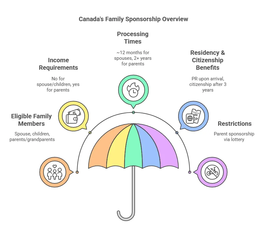 | Canada | Spouse/partner; children < 22; Parents/Grandparents (via lottery) | Must be Citizen or PR; No income required for spouse/child (income needed for parents) | ~12 months for spouses; Parents 2+ years if selected | Benefit: Spouse gets PR on arrival; broad family definition. Drawback: Parent visas limited by lottery; processing can be long for extended family. |
