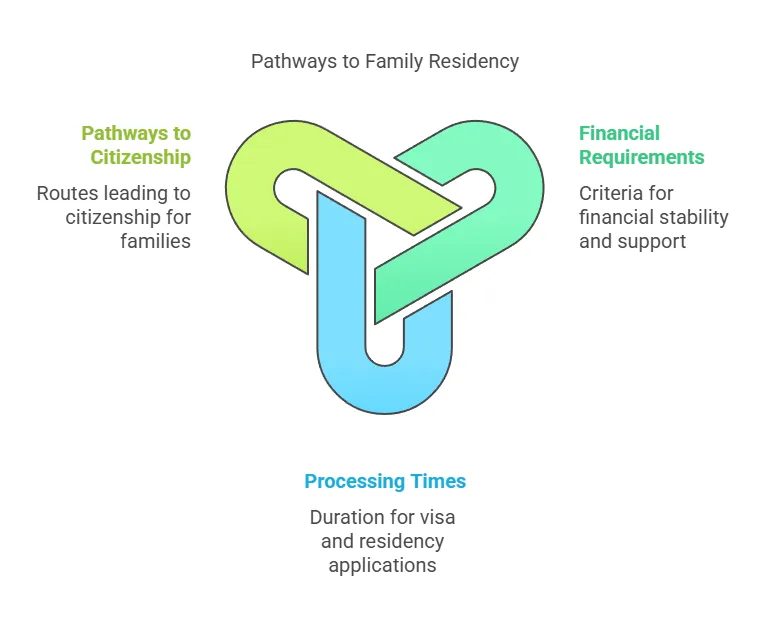 Residency and Citizenship Pathways: Whether family members get permanent residency and how/when they can qualify for citizenship.