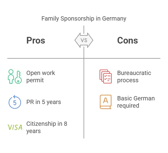 | Germany | Spouse/registered partner; children < 18 | Sponsor on valid residence (work/EU Blue Card/PR); must have adequate income & housing; No language required if sponsor is skilled worker (otherwise A1 German for spouse) | ~2–4 months (varies by embassy) | Benefit: Spouse gets open work permit PR possible after ~5 years; citizenship ~8 years (3 if married to German) Drawback: Bureaucracy and ~basic German needed eventually; cannot easily sponsor parents. |