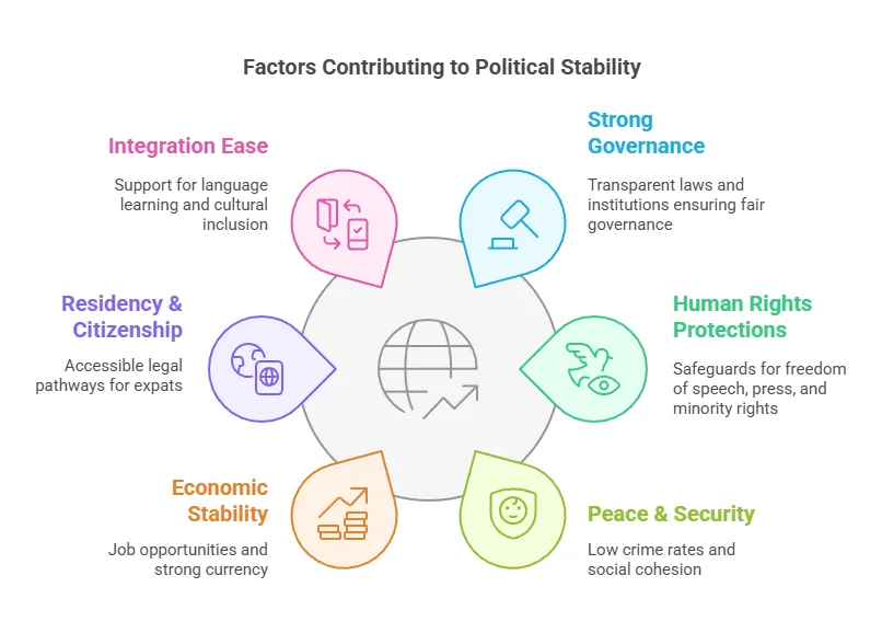 Political stability is a cornerstone of a high quality of life, influencing everything from economic growth to personal safety. Several key factors contribute to a country’s political stability, including economic stability, the healthcare system, cost of living, and social cohesion. Understanding these elements can help expats make informed decisions about where to relocate for a secure and fulfilling life.