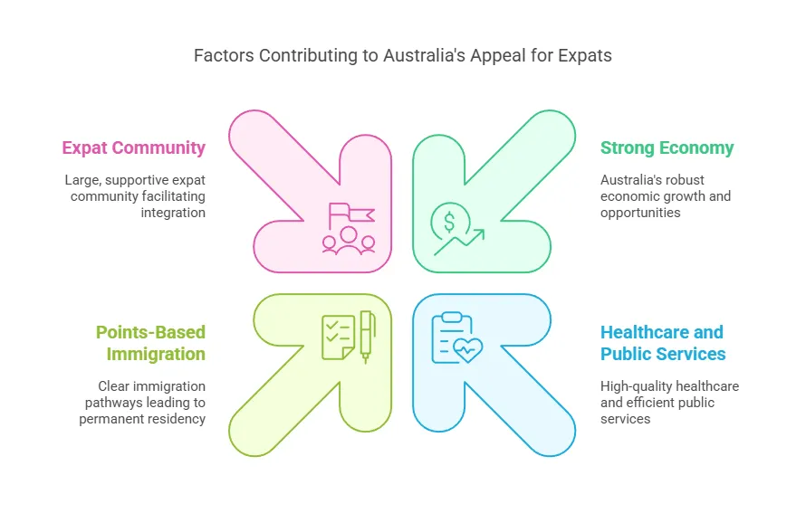 | Australia | Points system; Employer sponsor; Working Holiday; Family; Refugee (resettlement) | English (primary) | Climate and environment; High incomes; Diverse, immigrant-friendly | Distance from other continents; Expensive housing in Sydney/Melb; Strict border policies for asylum arrivals |