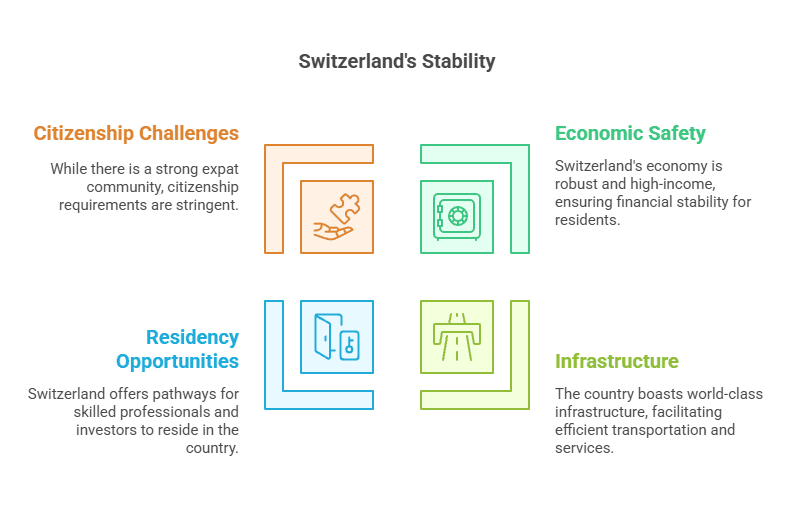 Switzerland has a global reputation as a bastion of stability – politically neutral, peacefully democratic, and prosperous. For expats formulating a “Plan B” country in case of political turmoil at home, Switzerland often comes to mind as a safe and orderly haven. This Alpine nation is unique: it’s not part of the EU, maintains military neutrality, and is home to numerous international organizations. It offers an exceptionally high standard of living and personal security, albeit with some challenges in immigration and integration due to its distinct system and multiple languages.