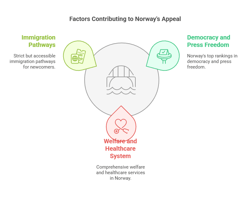 | Norway | Work permit -> PR; Family; Refugee (asylum) | Norwegian (English widely spoken) | Top democracy; High living standards; Extensive welfare | High cost of living; Norwegian language needed long-term; Strict immigration for non-EU |