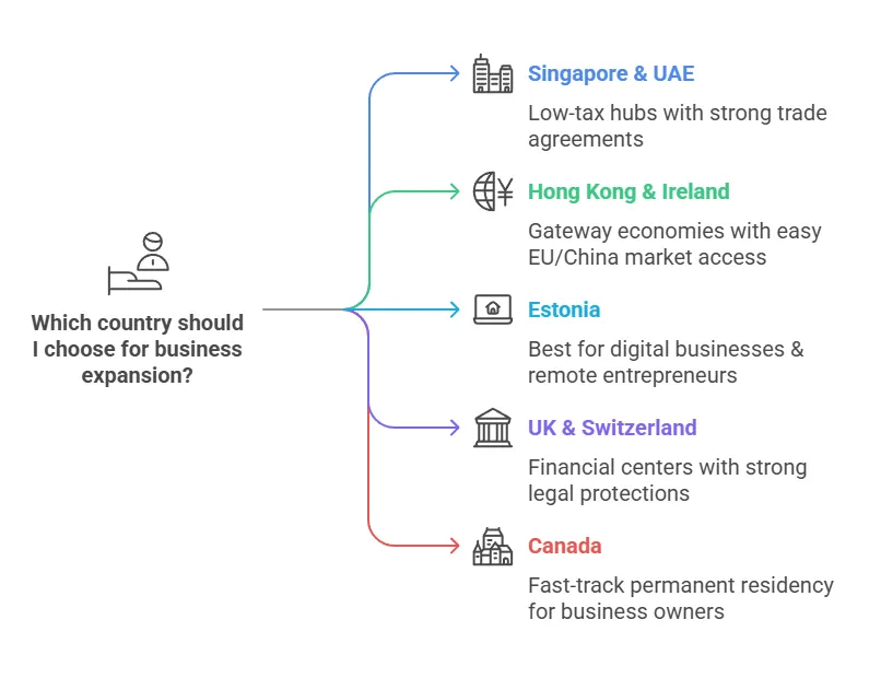 Each of these countries provides distinct advantages for expat business owners – from Singapore’s ultra-efficient bureaucracy and hub location, to the UAE’s tax-free zones, to Ireland’s EU market gateway and tech talent. Singapore, Hong Kong, UAE, Ireland, Estonia, the UK, Switzerland, and Canada all rank among the most favorable jurisdictions depending on your strategic priorities (be it lowest taxes, easiest compliance, market reach, or lifestyle). When choosing a destination for relocation or overseas expansion, consider how each factor aligns with your business plan and personal goals. With the right host country, expat entrepreneurs can enjoy lower taxes, smoother trade, supportive regulatory frameworks, and clear pathways to residency – empowering you to focus on innovation and growth in a truly global context.