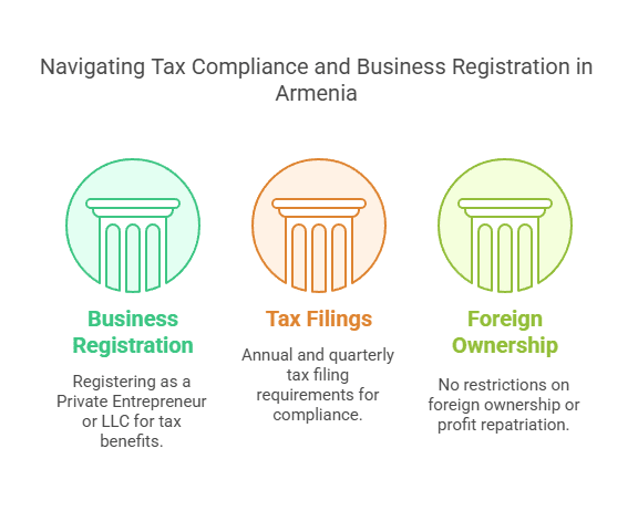 Բիզնեսի գրանցում. Եթե որոշեք գրանցվել որպես Անհատ ձեռնարկատեր կամ հիմնել ՍՊԸ, ապա դա կանեք Հայաստանի պետական ռեգիստրի միջոցով: Գործընթացը արագ է և էժան: Դուք կստանաք պետական գրանցման վկայական և հարկային նույնականացման համար (եթե չունեք այն, օտարերկրացիներին տրվում է հարկային վկայական գրանցումից հետո): Ձեր բիզնեսում տեղական գործընկեր, տնօրեն կամ բաժնետեր ունենալու պահանջ չկա. դուք կարող եք այն ամբողջությամբ տիրապետել և ղեկավարել որպես օտարերկրացի. Նաև պարտավոր չեք հայկական բանկային հաշիվ բացել, բայց դա խորհուրդ է տրվում հարմարության համար: Շատ օտարերկրյա ԱՁ/ՍՊԸ-ներ գործում են Հայաստանում բազմարժութային հաշիվներով, որպեսզի հեշտությամբ ստանան ԱՄՆ դոլար/Եվրո վճարումներ և անհրաժեշտության դեպքում փոխարկեն ՀՀ դրամի: Բարեբախտաբար, Հայաստանը պարտադրում է հայրենադարձության շահույթի սահմանափակումներ չկան – Դուք ազատ եք ձեր գումարը արտասահման տեղափոխելու ցանկացած հարկ վճարելուց հետո: