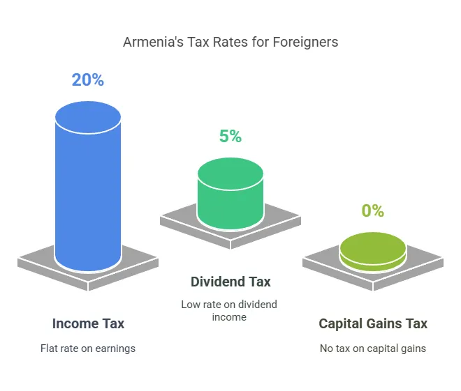 Հարմար եկամտահարկի դրույքաչափ. 2023 թվականից Հայաստանը պարտադրում է ա հարթ 20% հարկ անձնական եկամտի տեսակների մեծ մասի վրա՝ փոխարինելով հին առաջադեմ հարկային գոտիները։ Այս հաստատագրված դրույքաչափը վերաբերում է աշխատավարձերին, ինքնազբաղվածությունից և բիզնեսից եկամտին և այլ եկամուտներին: Օրինակ, եթե դուք ֆրիլանս եք կամ խորհրդակցում եք որպես ֆիզիկական անձ, ձեր զուտ եկամուտը հարկվում է 20%-ով: Գործատուները աշխատակիցների աշխատավարձից պահում են 20%-ը՝ որպես վերջնական հարկ: Այս պարզությունը դարձնում է ձեր պարտավորությունների հաշվարկը պարզ: