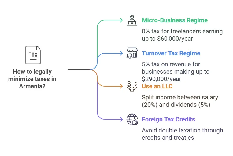 Անգամ Հայաստանի չափավոր հարկերի դրույքաչափերով. Հարկային զգույշ պլանավորումը կարող է նվազեցնել ձեր պարտավորությունները՝ հաճախ միանիշ կամ զրո. Ստորև ներկայացված են մի քանիսը օտարերկրյա հեռավար աշխատողների համար Հայաստանում օրինական ճանապարհով ավելի քիչ հարկ վճարելու ռազմավարություն, այս ամենը միևնույն ժամանակ լիովին համապատասխան լինելով Հայաստանի օրենսդրությանը: Դրանք տատանվում են՝ սկսած կացության ճիշտ կարգավիճակի ընտրությունից մինչև փոքր բիզնեսի համար նախատեսված հատուկ հարկային ռեժիմների օգտագործումը: Այս ռազմավարությունները հարկային օպտիմալացման ավելի լայն մոտեցման մի մասն են՝ նվազագույնի հասցնելու ձեր հարկային պարտավորությունը՝ միաժամանակ պահպանելով համապատասխանությունը Հայաստանի օրենսդրությանը: