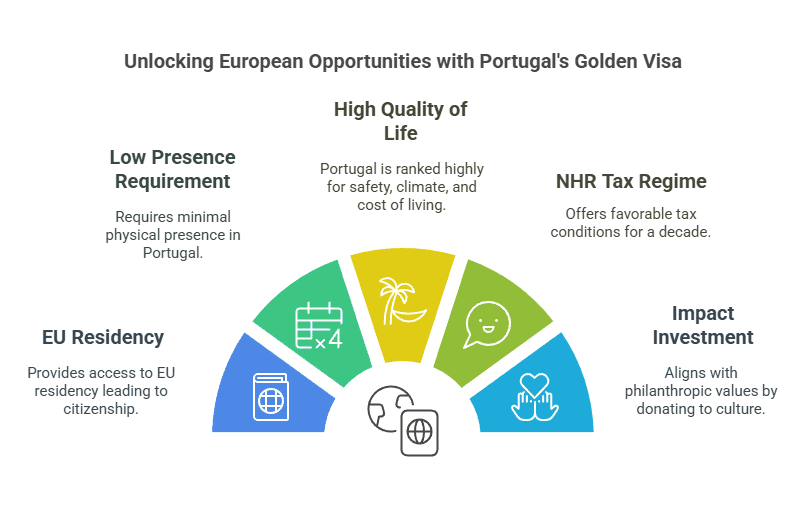 Perché scegliere il visto d'oro per le donazioni del Portogallo? Il Portogallo offre una combinazione di vantaggi che pochi paesi offrono: Residenza UE che porta alla cittadinanza UE, basso requisito di presenza fisica e una qualità della vita molto elevata. Il percorso di donazione è particolarmente indicato per coloro che preferiscono non è un per occuparsi di immobili o gestione aziendale. Donando alla cultura, non solo semplifichi il processo (nessun bene da detenere o vendere in seguito), ma contribuisci anche a preservare il ricco patrimonio del Portogallo. Molti investitori scelgono il Portogallo perché è uno dei modi più semplici per assicurarsi un Passaporto UE in un tempo relativamente breve (5 anni) senza doversi trasferire a tempo pieno o avere a che fare con la padronanza della lingua (il livello A2 è abbastanza raggiungibile). Il passaporto portoghese è estremamente potente e la cittadinanza conferisce diritti in tutta l'UE. Anche durante i 5 anni, poter viaggiare liberamente in Europa con una carta di residenza è un grande vantaggio. Inoltre, se si sceglie di vivere in Portogallo, è considerato uno dei posti migliori per gli espatriati, classificato in alto per sicurezza, clima e costo della vita. Regime fiscale NHR è la ciliegina sulla torta, rendendo potenzialmente il reddito globale di una persona leggermente tassato o esente da imposte per un decennio. Concentrandosi sull'investimento d'impatto (arte o scienza), anche la via della donazione si allinea ai valori filantropici. Pertanto, il Golden Visa basato sulle donazioni del Portogallo è un percorso eccellente per investitori focalizzati sull'impatto che vogliono mettere piede in Europa con la flessibilità di restare o di mantenere una presenza minima finché non ottengono la cittadinanza.