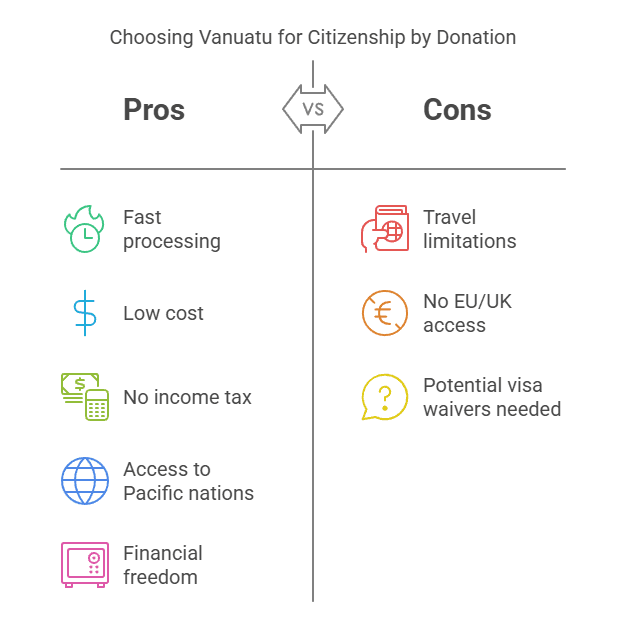 Perché scegliere Vanuatu? Le ragioni principali sono velocità, costi e vantaggi fiscali. Per qualcuno che ha urgente bisogno di un secondo passaporto (forse a causa dell'instabilità politica in patria o di improvvise esigenze di viaggio), Vanuatu è ineguagliabile nei tempi di consegna, potenzialmente inferiori a 2 mesi, rispetto ai 4-6+ mesi di altri. È anche relativamente conveniente; una singola donazione di $ 130k è inferiore alla soglia di donazione per la cittadinanza di qualsiasi altro paese. La mancanza di imposte sul reddito è la ciliegina sulla torta, che attrae coloro che potrebbero effettivamente prendere in considerazione l'idea di trasferirsi in un tranquillo paradiso tropicale a basso costo. D'altro canto, si dovrebbe soppesare il limitazioni di viaggio – senza accesso UE/UK al momento, il passaporto di Vanuatu non è così potente. Se quelle esenzioni dal visto venissero ripristinate, il numero dei suoi passaporti salirebbe a circa 130 paesi. Anche così, Vanuatu fornisce accesso a una diversa sfera di paesi (è una porta d'accesso a certe nazioni del Pacifico e del Commonwealth). Per gli investitori con esigenze specifiche o quelli provenienti da paesi i cui passaporti sono molto deboli, Vanuatu offre un rapido miglioramento della mobilità globale e un piano B in un paese remoto e sicuro. In sintesi, scegli Vanuatu per esecuzione rapida e libertà finanziaria, tenendo conto degli sforzi in corso per migliorare la reputazione del suo passaporto.