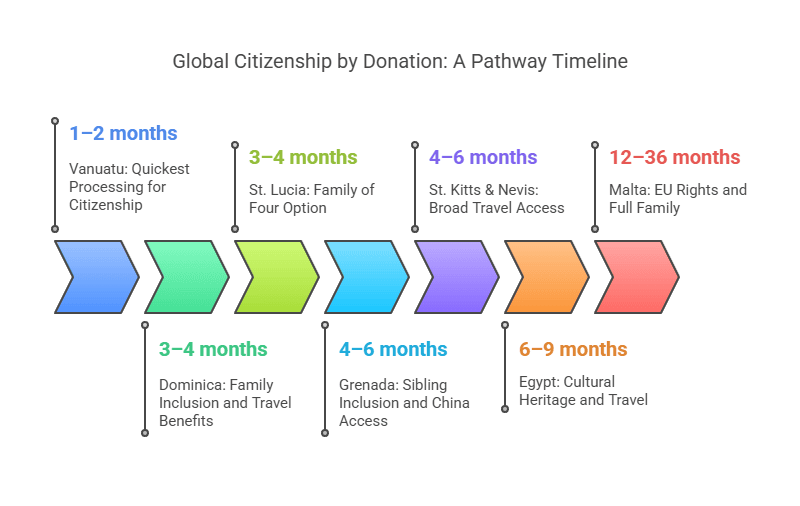 Tempi di elaborazione e pianificazione: Molti programmi di donazione vantano un'elaborazione rapida: 3-6 mesi per i CIP caraibici, Anche 1-2 mesi per VanuatuI programmi di residenza variano: Portogallo ~6-12 mesi, Italia ~3 mesi, Anguilla ~3 mesi. Se il tempo è critico (ad esempio, hai bisogno urgentemente di un secondo passaporto a causa di instabilità politica o esigenze di viaggio), prendi in considerazione le opzioni più rapide (i processi accelerati di Vanuatu o St. Kitts, tenendo presente che la corsia preferenziale di 60 giorni di St. Kitts è stata sospesa). Aggiungi sempre del tempo extra per la raccolta dei documenti e ritardi imprevisti. Per i percorsi di cittadinanza, una volta approvati, di solito ricevi il passaporto subito dopo, mentre i percorsi di residenza significano un periodo d 'attesa (anni) prima del passaporto: pianificare di conseguenza se l'obiettivo finale è la cittadinanza.