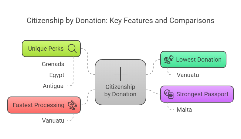 Oltre alla cittadinanza per donazione, ce ne sono alcune degne di nota programmi di residenza tramite investimento dove l'investimento primario è un donazione a un fondo governativo o a un'iniziativa approvata. Questi programmi garantiscono un permesso di residenza (temporaneo o permanente) anziché la cittadinanza immediata, ma spesso con un percorso verso la cittadinanza nel tempo. Sono ideali per coloro che potrebbero non aver bisogno di un nuovo passaporto subito ma vogliono la possibilità di vivere, lavorare o eventualmente naturalizzarsi nel paese ospitante.