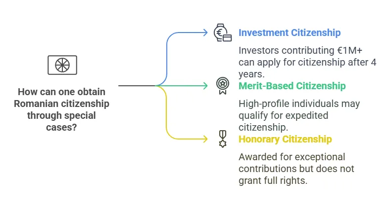 Особые гуманитарные случаи: Иногда президент или правительство Румынии могут предложить гражданство человеку, который оказал особые услуги, или в случаях гуманитарной необходимости (например, человеку, который спас жизни румын и т. д.). Это крайне необычно и будет решаться посредством законодательной или исполнительной инициативы. По сути, если румынские власти видят стратегическую выгоду или моральное обязательство, они могут делать исключения.
