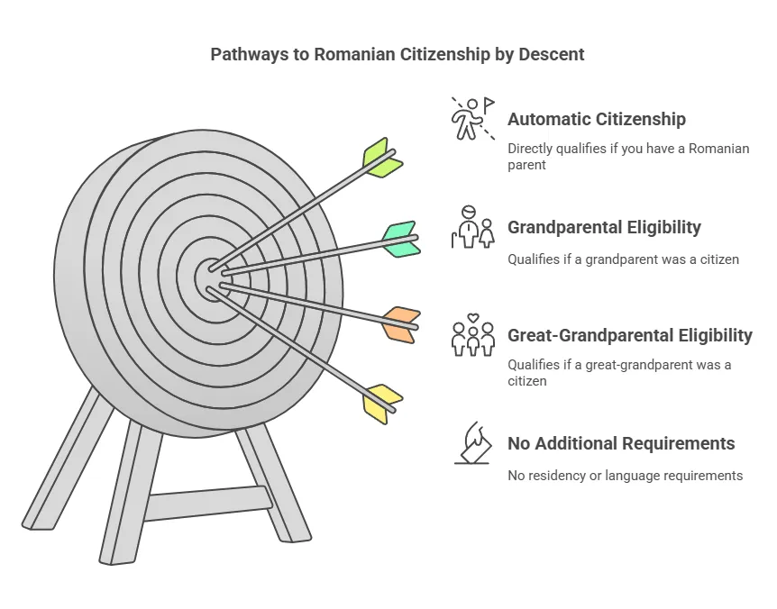 Одним из основных способов получения румынского гражданства и, таким образом, гражданства ЕС является происхождение – либо рождение от румынских родителей, либо доказательство румынского происхождения. Закон о гражданстве Румынии основан на jus sanguinis (право крови), то есть гражданство передается от родителей к детям. Оно также имеет щедрые положения для тех, у кого румынское происхождение, чтобы они могли «репатриироваться» или вернуть себе гражданство даже спустя поколения.